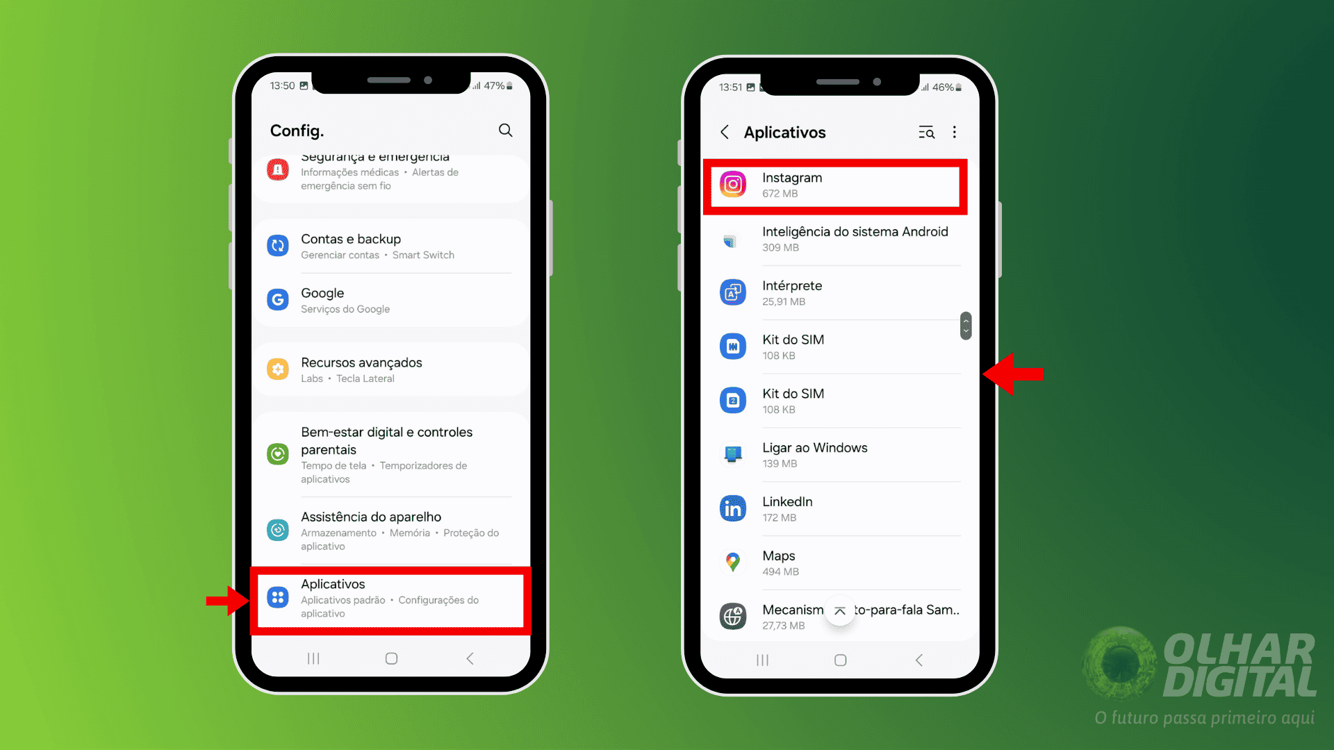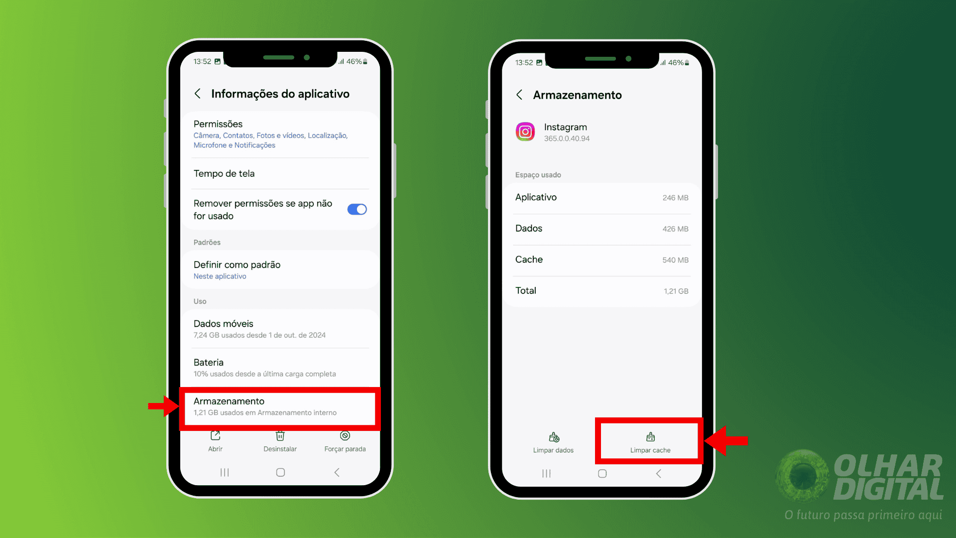 Já nos aplicativos, você precisa acessar as configurações do aparelho e excluir individualmente o cache de cada app. Veja: