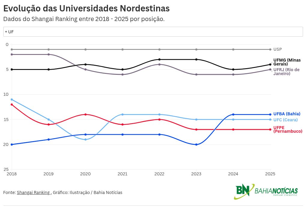 A Universidade Federal da Bahia (UFBA) emergiu como a melhor universidade do Nordeste no Ranking Acadêmico de Universidades do Mundo (ARWU) ou Ranking de Xangai (Shanghai) 2025. O resultado é notável, após uma queda considerável em 2023 e uma retomada inesperada na liderança pelo Nordeste. O Bahia Notícias teve acesso ao relatório completo do Ranking Acadêmico