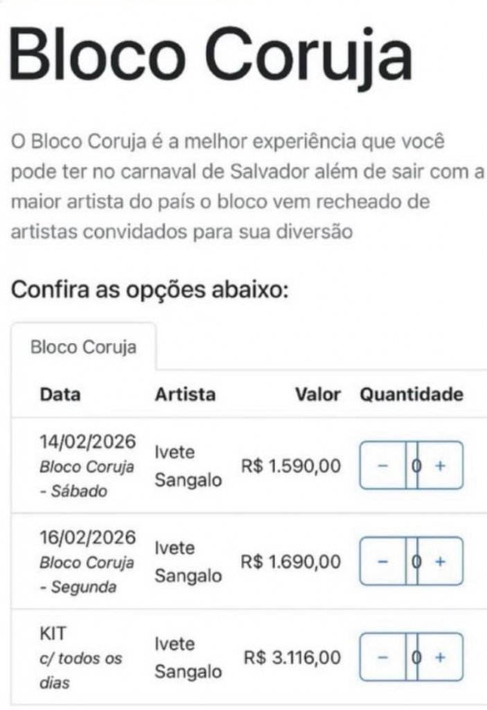 O Bloco Coruja, de Ivete Sangalo, iniciou as vendas para o Carnaval de Salvador em 2026 nesta segunda-feira (15). Para o próximo ano, a artista irá desfilar dois dias, os mesmos que em 2025, sábado e segunda. Para desfilar com “Mainha”, o folião terá que desembolsar R$ 1590,00, no abadá mais barato, o do […]