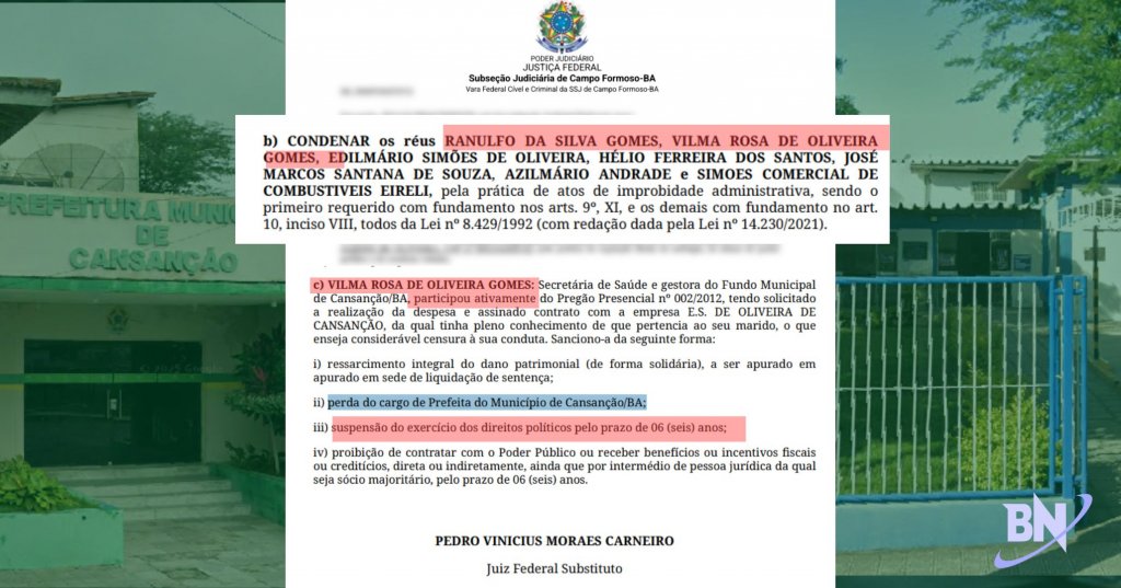 A prefeita de Cansanção, Vilma Gomes (MDB), foi condenada pela Justiça Federal, Subseção Judiciária de Campo Formoso, à perda imediata do mandato e à suspensão dos direitos políticos por seis anos. A decisão, proferida na última sexta-feira, (17), refere-se a atos de improbidade administrativa cometidos entre 2011 e 2015, estimado em um valor ultrapassado de R$ 8 […]