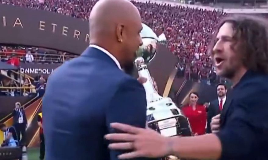 Felipe Melo e Julio César Entraram no Estádio Carregando o Troféu da Libertadores Acompanhados por Carles Puyol