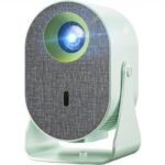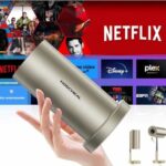 Possui conectividade Wi-Fi para espelhamento de tela, além de entradas HDMI e USB. É compatível com celulares Android/iOS, notebooks, TV Box e pendrives. Seu tamanho reduzido e design com base rotativa o tornam ideal para apresentações rápidas ou sessões de filmes em qualquer lugar.