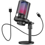 Microfone RGB Condensador Com Conector De Monitoramento De Fone De Ouvido USB Profissional Controle De Luz Gamer Para Computador Jogos Transmissao Ao Vivo Plug And Play – TOMATE (Preto)