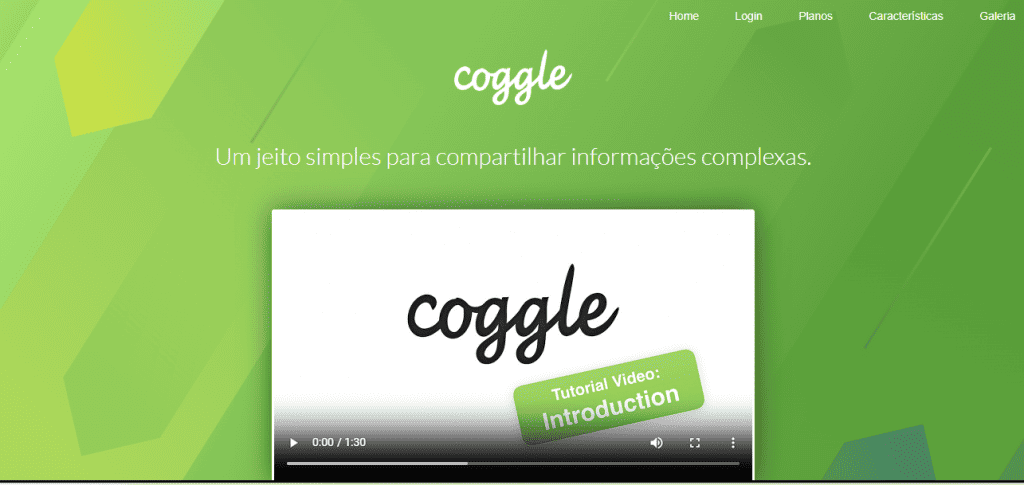 O Coggle é uma ferramenta online de criação de mapas mentais que ajuda a estruturar ideias de maneira simples e intuitiva. Ele permite adicionar ramos de conexão entre conceitos, usar cores diferentes para categorizar informações e colaborar com outras pessoas em tempo real. Na tela inicial, há um vídeo tutorial dando uma ideia do seu funcionamento.