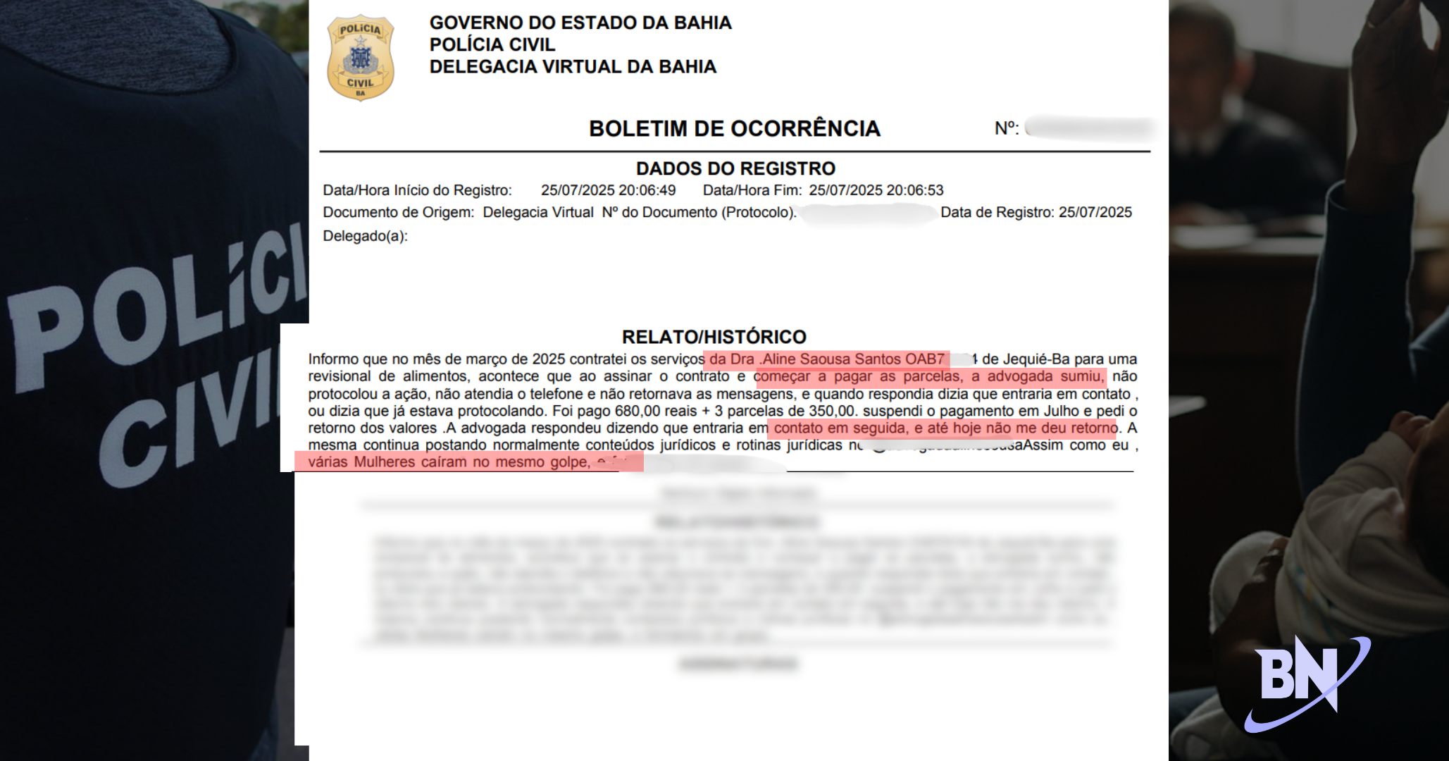 Algumas vítimas registraram boletim de ocorrência formal nos últimos meses, mas seguem sem retorno. O BN teve acesso a um boletim feito ainda em julho na 23ª Delegacia Territorial de Lauro de Freitas, por estelionato (art. 171 do CPB). Segundo o registro, a advogada teria sumido após receber pagamentos referentes a uma ação de revisão de alimentos, sem protocolar a ação ou atender as mensagens da vítima.