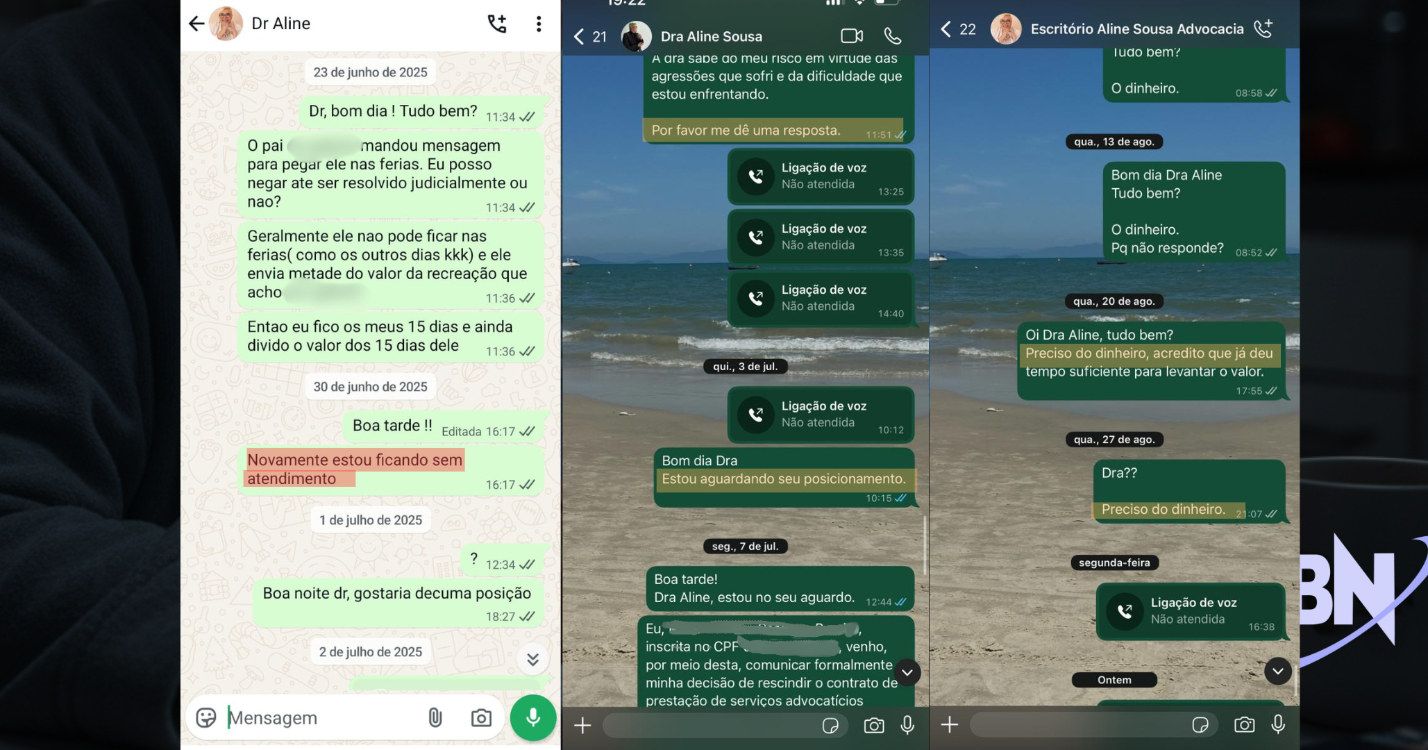 Questionada sobre o tempo dos pagamentos, Aline afirmou a equipe BN que se resguarda o direito de se pronunciar “em momento oportuno e de forma adequada”, preservando, segundo ela, sua dignidade e a ética profissional. A advogada acrescentou que “qualquer comunicação ou esclarecimento será feito de maneira formal e através dos canais apropriados”.