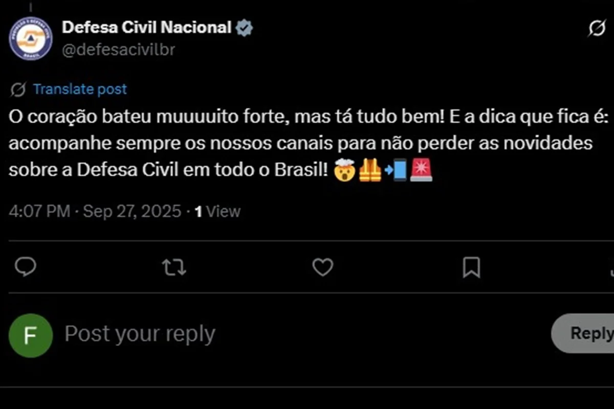 Outra usuária sofreu um “acidente” com o alerta. “A Defesa Civil meteu o alerta extremo. Meu celular começou a apitar, tomei um tombo da cama, achei que o mundo estivesse acabando… E era só uma demonstração”, disse.