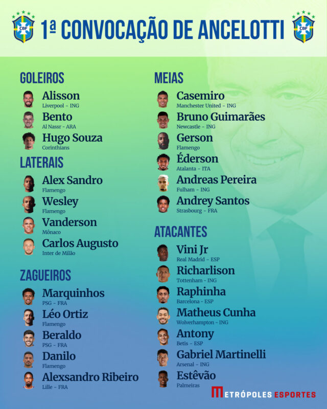 Apresentado nesta segunda-feira (26/5) como novo treinador da Seleção Brasileira, Carlo Ancelotti revelou os atletas convocados para os dois primeiros compromissos no comando da Amarelinha.