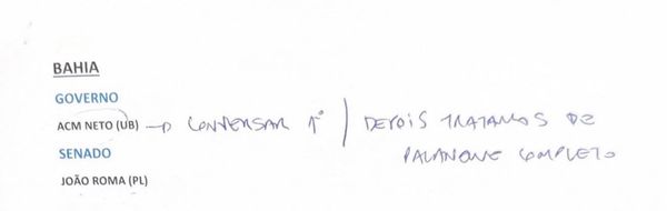 Nas anotações, intituladas “situação nos estados”, Flávio expressa interesse em caminhar ao lado de ACM Neto (União), mas ressalta que uma conversa será necessária antes de qualquer anúncio oficial. Além disso, o bolsonarista já teria confirmado apoio a João Roma para o Senado Federal.