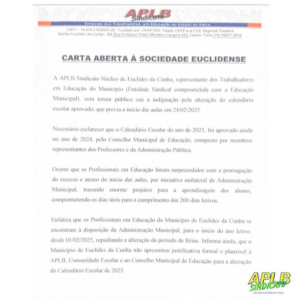 A APLB Sindicato Núcleo de Euclides da Cunha, entidade que representa os Trabalhadores em Educação do município, divulgou uma carta aberta à sociedade euclidense expressando indignação com a alteração do calendário escolar de 2025.