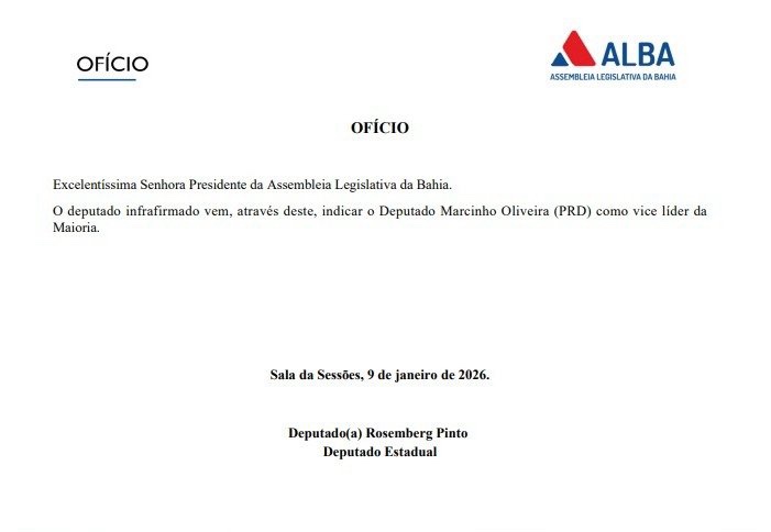 “Excelentíssima Senhora Presidente da Assembleia Legislativa da Bahia. O deputado infrafirmado vem, por meio deste, indicar o Deputado Marcinho Oliveira (PRD) como vice-líder da Maioria”, escreveu Rosemberg Pinto no documento.