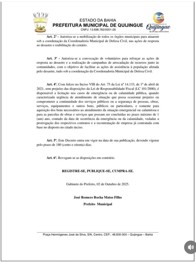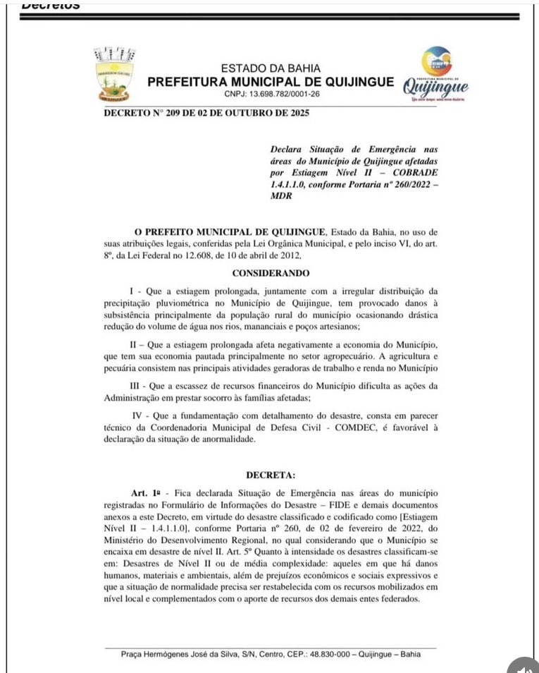 Ontem, no diário oficial, foi publicado um decreto de emergência em virtude de estiagem destacando que o município está sem recursos financeiros para ajudar as famílias atingidas.