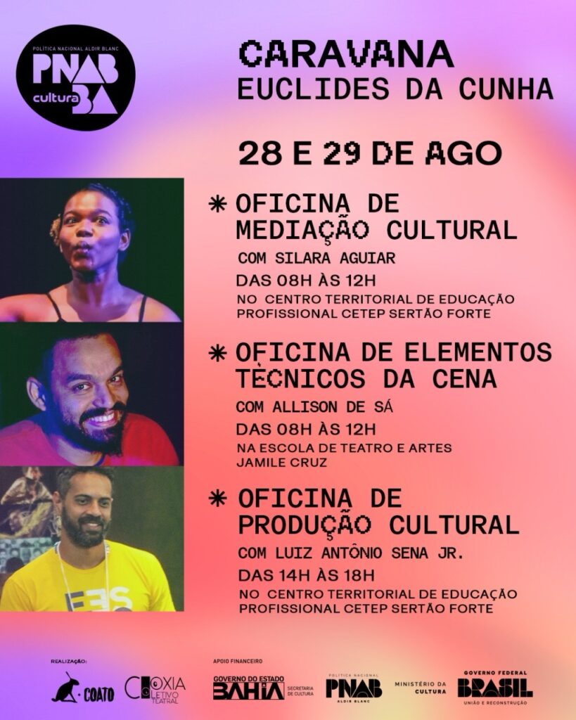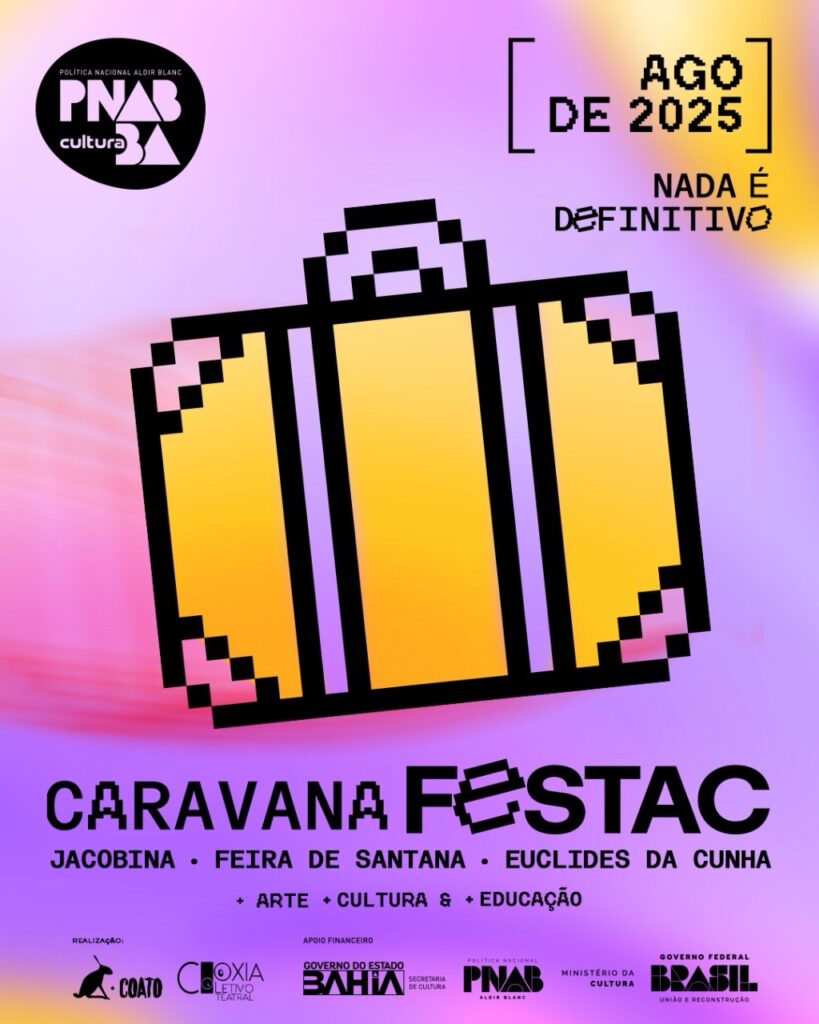 Nos dias 28 e 29 de agosto, a Caravana FESTAC Ano 7 chega a Euclides da Cunha, fortalecendo o elo entre formação artística e circulação cultural no interior da Bahia. A etapa será realizada no Centro Cultural de Euclides da Cunha, com oficinas gratuitas que convidam jovens, estudantes, educadores e agentes culturais a experimentarem, na prática, processos essenciais para a criação e produção de espetáculos.