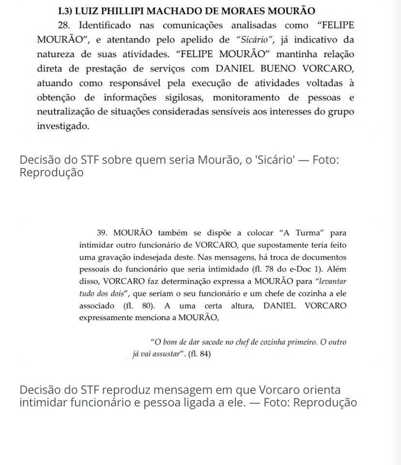 A investigação aponta uma “dinâmica violenta evidenciada pelas conversas entre Vorcaro e Mourão”, e indica que ele atuaria como ‘longa manus‘ (expressão do contexto jurídico que indica um agente que atua em nome de outro) da prática das práticas violentas atribuídas à organização.