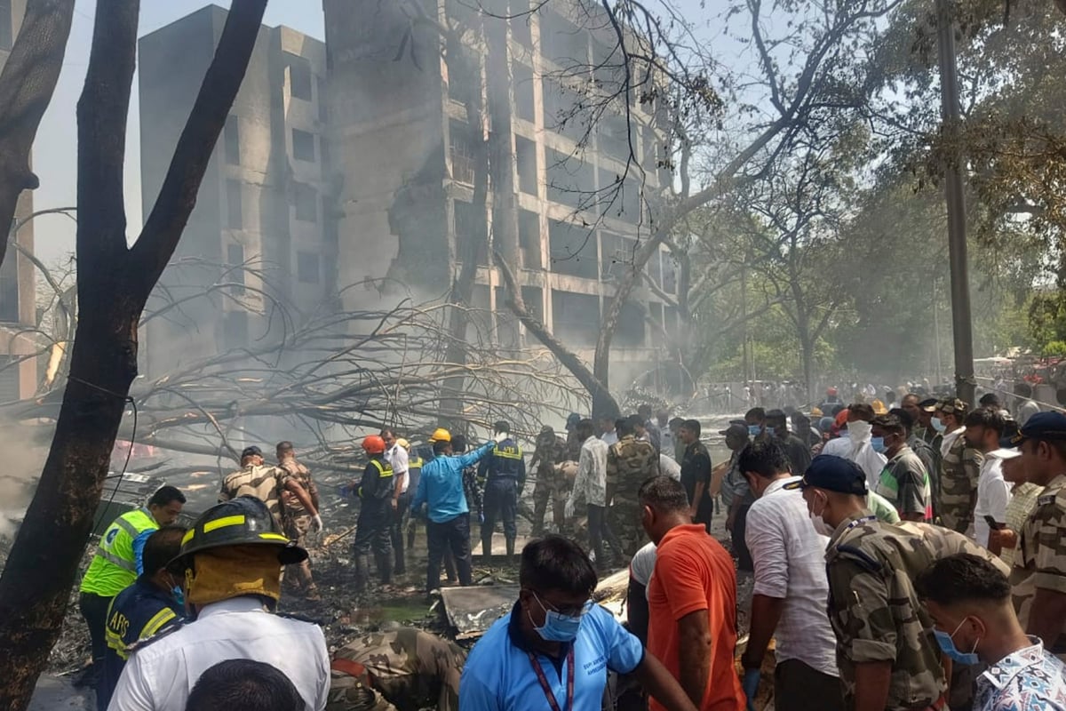 A aeronave, um Boeing 787-8 Dreamliner, caiu logo após a decolagem do aeroporto de Ahmedabad, na povoada área de Meghani. Colunas de fumaça preta foram vistas subindo do local do acidente, conforme registrado em imagens compartilhadas pela imprensa local.