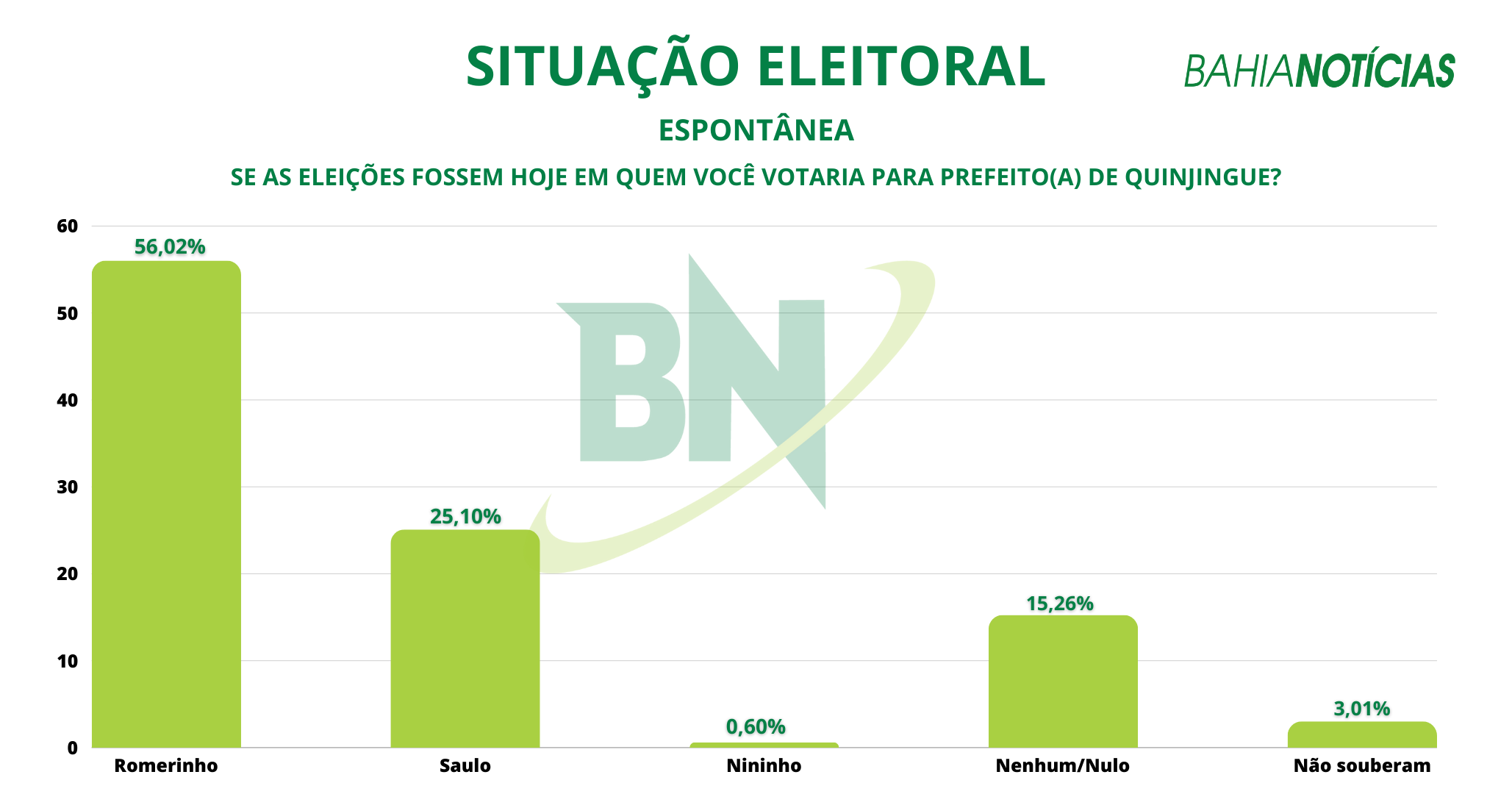 Na pesquisa espontânea, quando não são apresentados os nomes dos candidatos, o atual prefeito, Nininho, que está indisponível para reeleição, aparece em 0,60% das respostas; enquanto seu vice, Romerinho, aparece com 56,02%. O candidado da oposição, Saulo da Arena (PT), aparece em 25,10% das respostas. Outros 15,26% dos entrevistados não votariam em nenhum e 3,01% não souberam ou não opinaram.