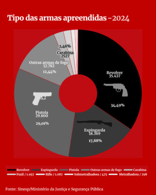 No recorte comparativo entre 2019 e 2024, fica evidente o crescimento em apreensões de armas mais potentes. O revólver, a arma em maior circulação no Brasil, no primeiro ano destacado representava 38,8% das apreensões, já no ano passado ele caiu para 34,4%. Enquanto isso, a pistola apresentou crescimento, saindo de 17,1% para 29%.