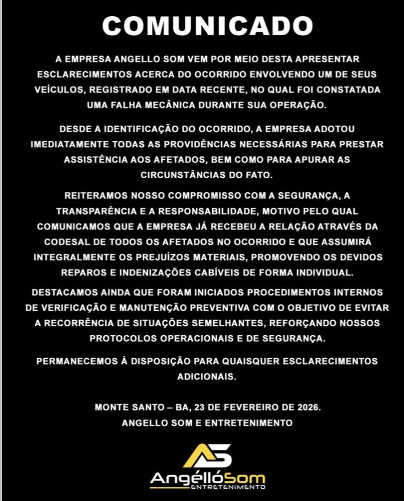 Diante da repercussão do caso, a empresa Angello Som e Entretenimento divulgou nota oficial informando que está adotando todas as providências necessárias e seguindo a tramitação legal relacionada ao ocorrido.
