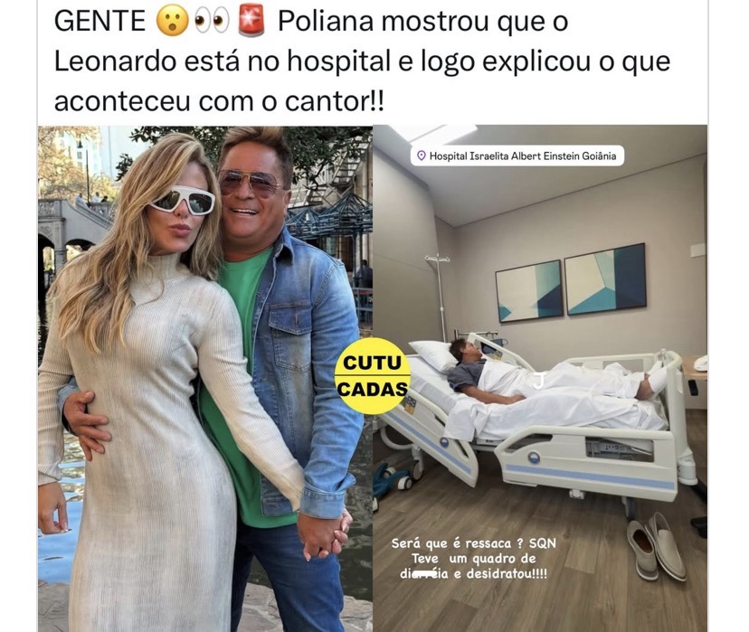 O cantor Leonardo foi internado nesta segunda-feira, 8, no Hospital Israelita Albert Einstein, em Goiânia. Nas redes sociais, a esposa do artista, Poliana Rocha, compartilhou imagens dele em uma cama de hospital.