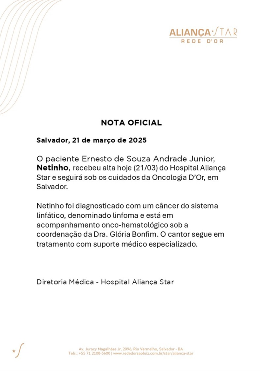 O cantor Netinho, de 58 anos, foi diagnosticado com câncer do sistema linfático. O anúncio ocorreu pelo boletim médico no site oficial do artista. Informações são do Correio.