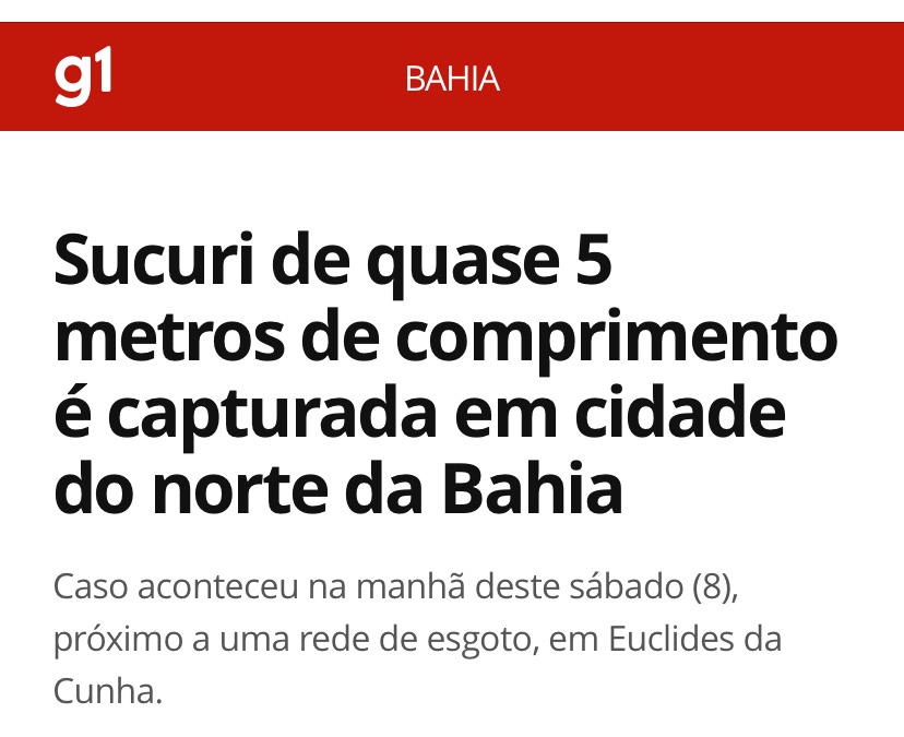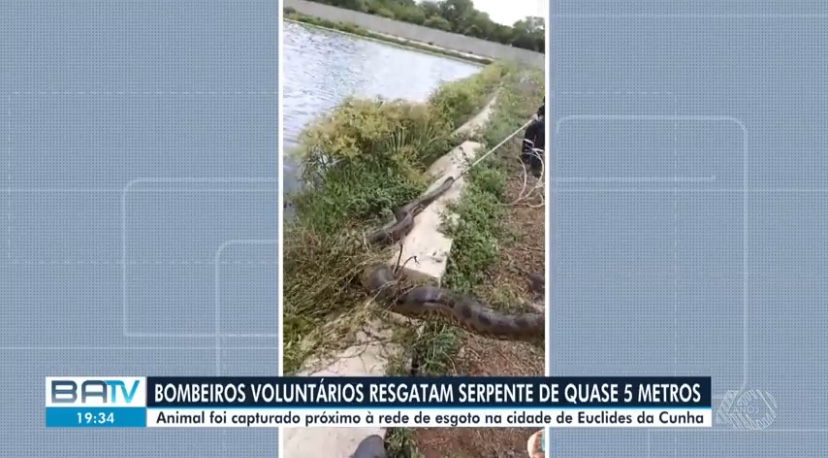 Uma sucuri de 4,8 metros de cumprimento foi resgatada na rede de esgoto da cidade de Euclides da Cunha, Bahia, neste sábado, 8. O animal foi capturado pelo grupo de Bombeiros Voluntários Anjos do Cumbe. Um drone foi utilizado para auxiliar na localização da sucuri.