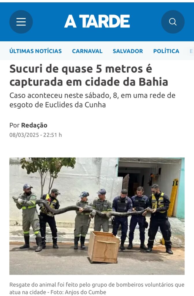 A captura de uma sucuri de quase 5 metros realizada ontem dia 08 de março pela Equipe de Bombeiros Voluntários Anjos do Cumbe e noticiada pelo portal de notícias Web Euclides de Jairo Souza rapidamente se difundiu pela internet e virou notícia nos principais jornais da Bahia, como o Jornal A Tarde, G1 Bahia e BATV.