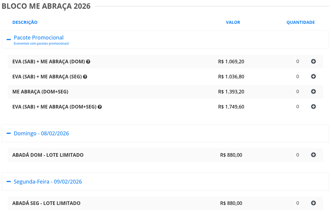 Já os blocos Me Abraça e Bloco Eva estão sendo vendidos em uma promoção, podendo comprar os dois dias com Durval Lelys e um dia com o Eva por R$ 1.749,60.