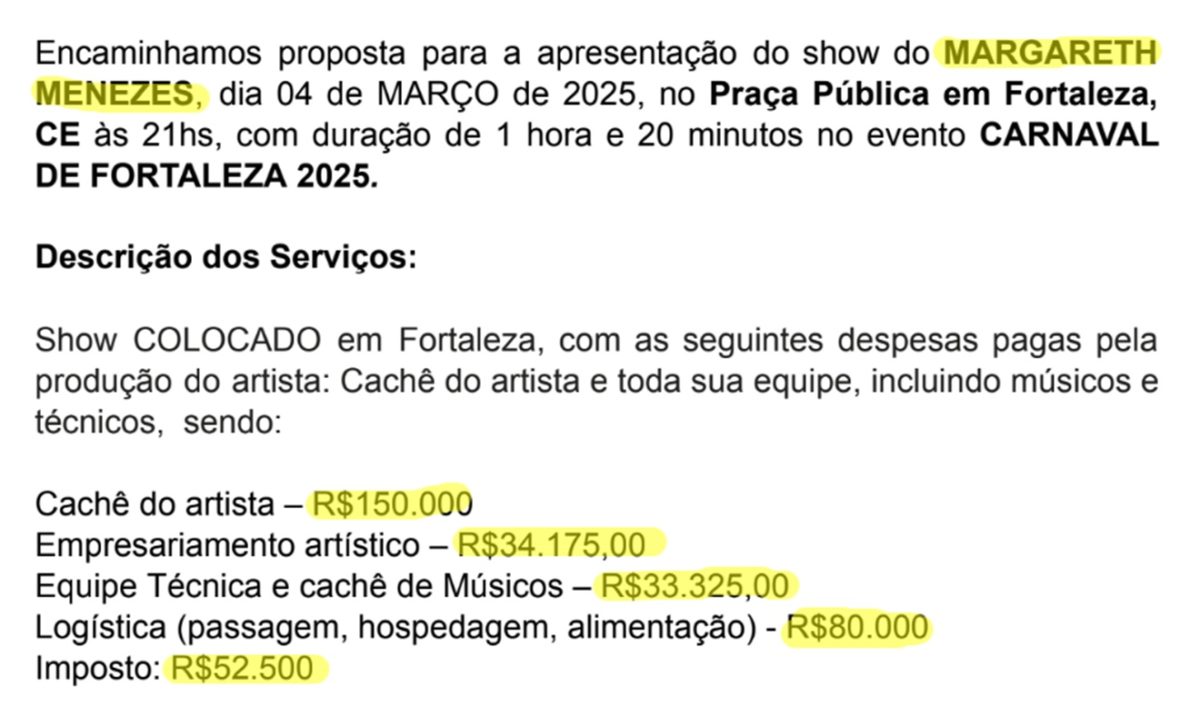 Margareth encerrou a turnê de Carnaval em Fortaleza. A prefeitura local contratou a artista por R$ 350 mil para a realização de um show na terça-feira (4/3). Do valor total do contrato, R$ 150 mil foram pagos a título de cachê da ministra, de acordo com a proposta de orçamento enviada pela artista à Secretaria de Cultura de Fortaleza (Secultfor). Outros R$ 34,1 mil foram destinados à empresária da cantora, R$ 33,3 mil à equipe técnica e a cachês de músicos, R$ 80 mil a passagens, hospedagens e alimentação e R$ 52,5 mil a impostos.