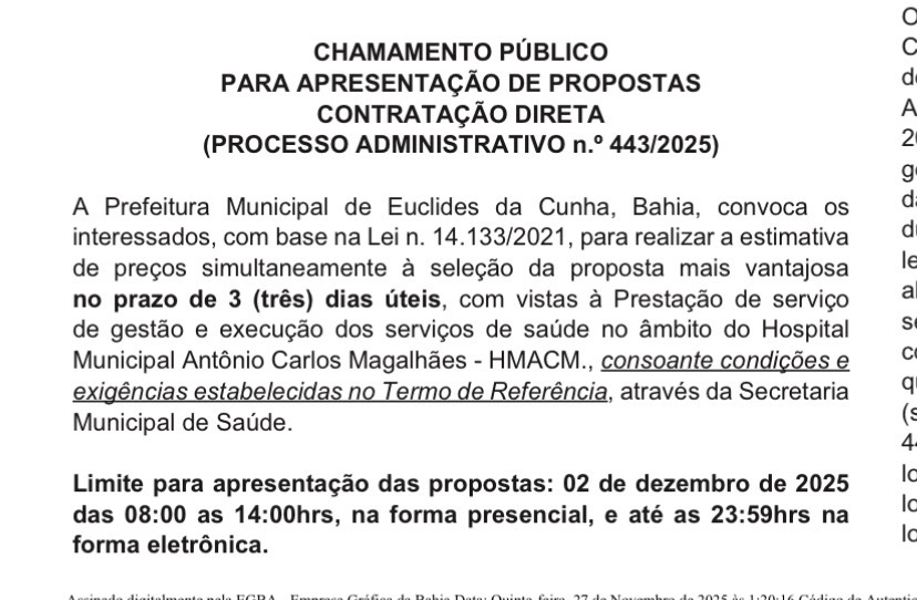 A Prefeitura Municipal de Euclides da Cunha publicou um Chamamento Público para apresentação de propostas visando a contratação direta de uma instituição responsável pela gestão e execução dos serviços de saúde do Hospital Municipal Antônio Carlos Magalhães (HMACM). O processo, de nº 443/2025, está fundamentado na Lei Federal nº 14.133/2021 e tem prazo de três dias úteis para envio das propostas.