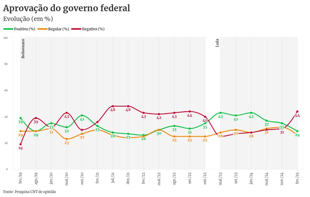 Quanto ao governo federal, a avaliação negativa registrou crescimento de 13 pontos percentuais em relação à rodada anterior, de novembro de 2024, quando era de 31%, e chegou a 44%.