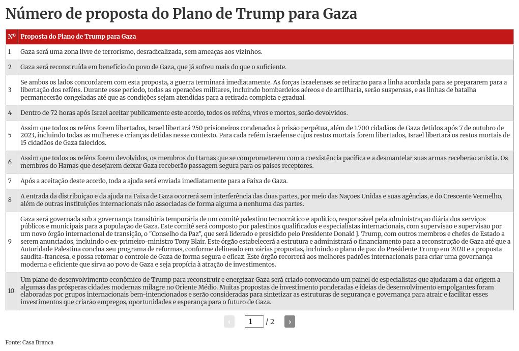 - A primeira fase se destaca pelo cessar-fogo imediato e a libertação de cerca de 2 mil prisioneiros palestinos após o reféns retornarem a Israel.