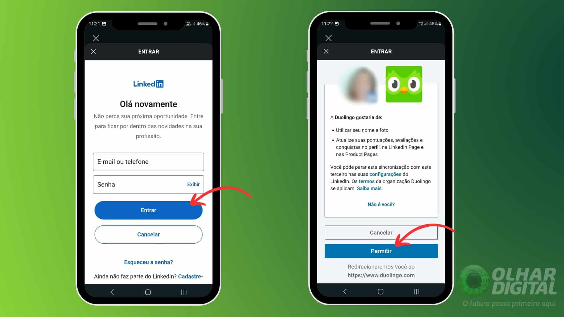 - Na próxima tela, faça login na sua conta do LinkedIn e toque em “Entrar”. Depois, clique em “Permitir”.