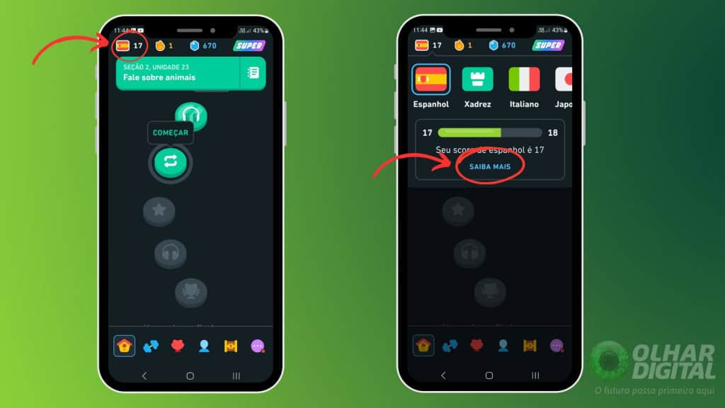 - Abra o aplicativo Duolingo e acesse o seu curso atual. Depois, toque em “Saiba mais” para ver mais detalhes.