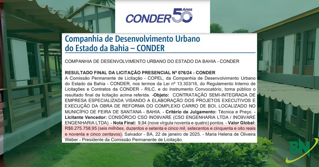 A Companhia de Desenvolvimento Urbano do Estado da Bahia (Conder) anunciou nesta segunda-feira (22) o resultado da licitação para a reforma do Complexo Carro de Boi, um espaço cultural de Feira de Santana. O consórcio CSO INO9VARE foi o vencedor da disputa, apresentando a melhor proposta técnica e financeira, no valor de R$ 6,2 milhões.