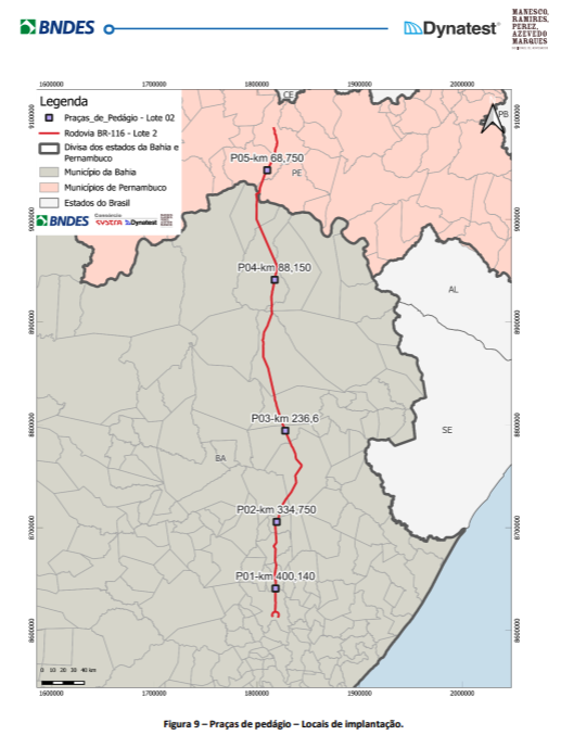 Ao todo, são previstas a implantação de cinco praças de pedágio, sendo quatro na Bahia. São elas: no KM 400 da BR-116, em Feira de Santana; em Teofilândia, na altura do KM 334 da rodovia; no município de Quijingue, no KM 236 da BR; e em Chorrochó, no KM 88.