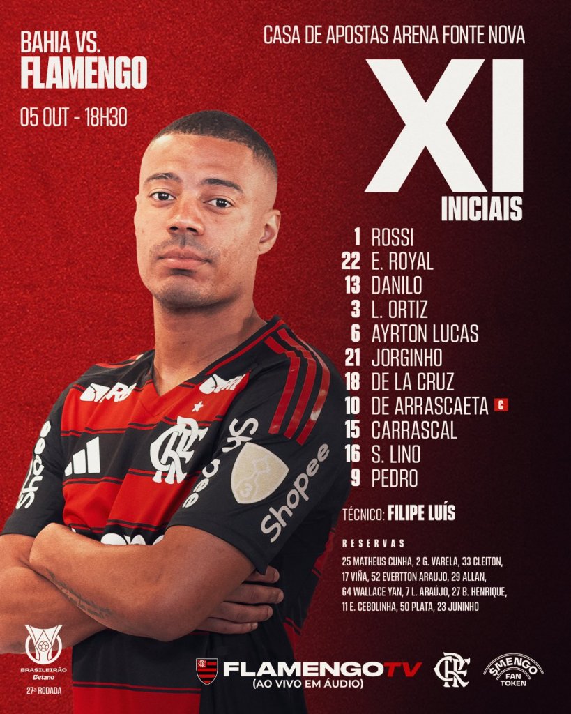 Líder do Brasileirão, o Flamengo busca ampliar a vantagem sobre os concorrentes diretos na luta pelo título. O técnico Filipe Luís definiu a equipe com Rossi; Emerson Royal, Danilo, Léo Ortiz e Ayrton Lucas; Jorginho, De La Cruz e De Arrascaeta; Samu Lino, Jorge Carrascal e Pedro.