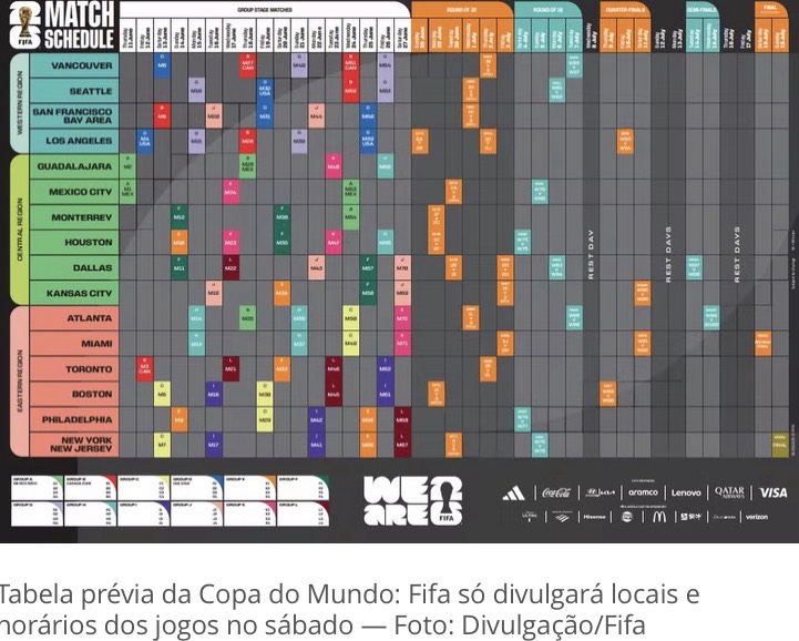 Apenas no sábado a Fifa divulgará a tabela completa da Copa do Mundo – ainda estão em aberto horários e locais das partidas. Para revelar a tabela completa, a Fifa fará uma transmissão ao vivo, que contará com a participação de ex-jogadores e especialistas, que analisarão os confrontos. O evento será realizado às 14h (de Brasília) de sábado.