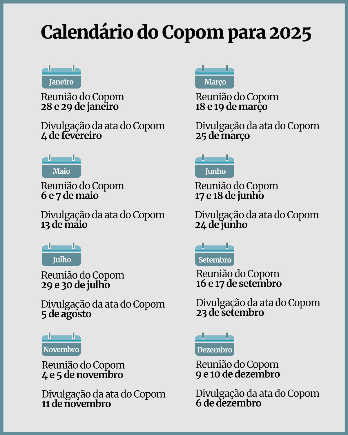 - A próxima reunião do Copom está prevista para os dias 6 e 7 de maio.