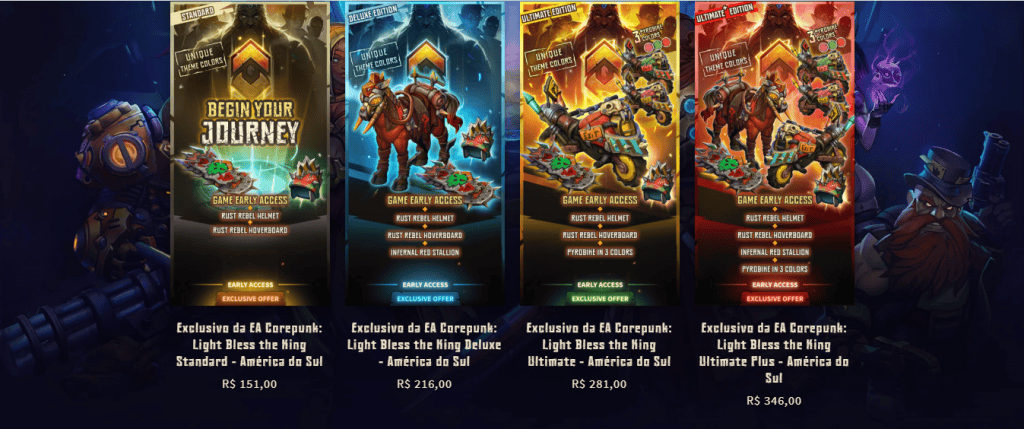 Para jogar o “Corepunk”, você pode escolher entre 4 pacotes, começando pelo valor de R$ 151 no “Light Bless the King Standard – América do Sul”. A opção mais cara é a “Light Bless the King Ultimate Plus – América do Sul”, que custa R$ 346.