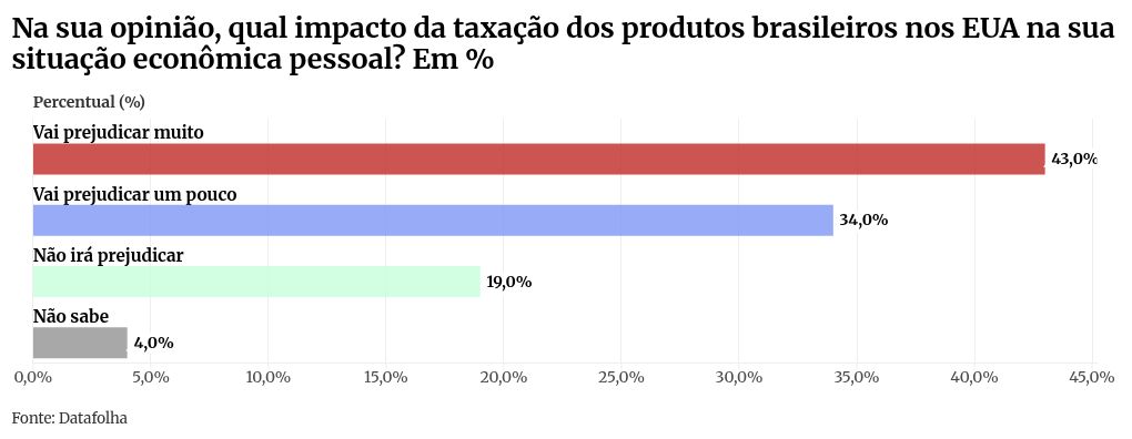 O Datafolha perguntou aos entrevistados “Qual impacto da taxação dos produtos brasileiros nos EUA na economia brasileira?”. Do total, 66% responderam que vai prejudicar muito e 23% que vai prejudicar um pouco, resultando nos 89% que consideram o impacto da medida de Trump na economia nacional. Outros 7% que acreditam que o tarifaço não levará impacto à economia e 4% não souberam responder.