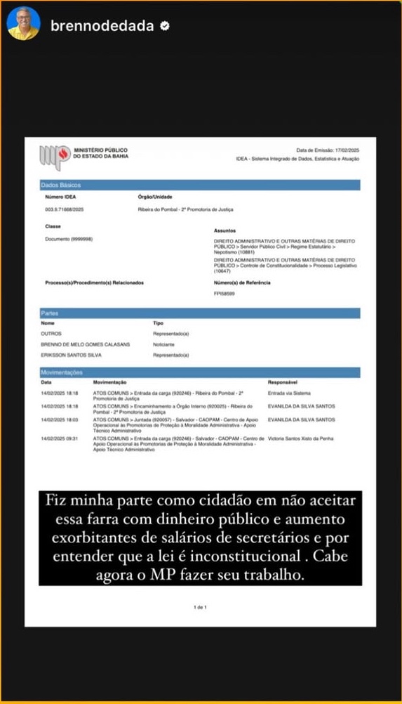 Brenno de Dadá protocolou uma denúncia no Ministério Público contra o prefeito de Ribeira do Pombal, Eriksson Silva, por nepotismo e aumento ilegal dos salários de secretários municipais. A lei que concedeu o reajuste no valor de R$ 11,9 mil teria sido aprovada de forma inconstitucional, segundo o denunciante, e beneficiaria diretamente a esposa do prefeito e sua cunhada, que ocupam cargos na administração municipal.