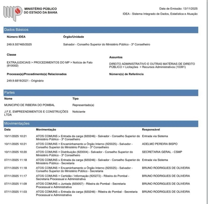 De acordo com informações da redação, o Ministério Público já está de posse das duas denúncias — uma sobre fraude no procedimento licitatório e outra referente à execução da obra e aos aditivos contratuais. Os documentos foram protocolados sob o número MP IDEA: N° 249.9.557465/2025.