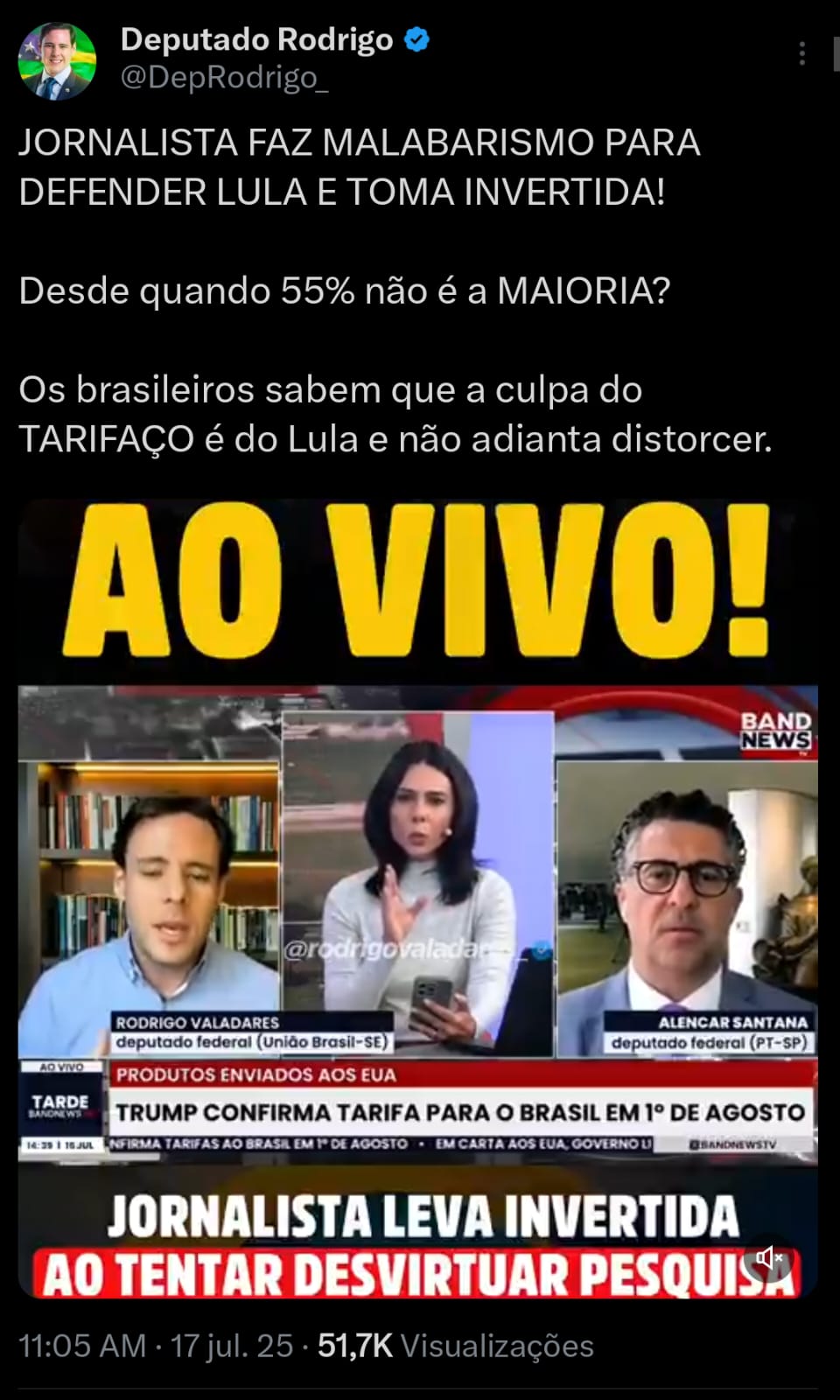 No X, e logo após o programa, Rodrigo Valadares postou vídeo da entrevista em tom de comemoração: “Jornalista faz malabarismo para defender Lula e toma invertida!”, postou.
