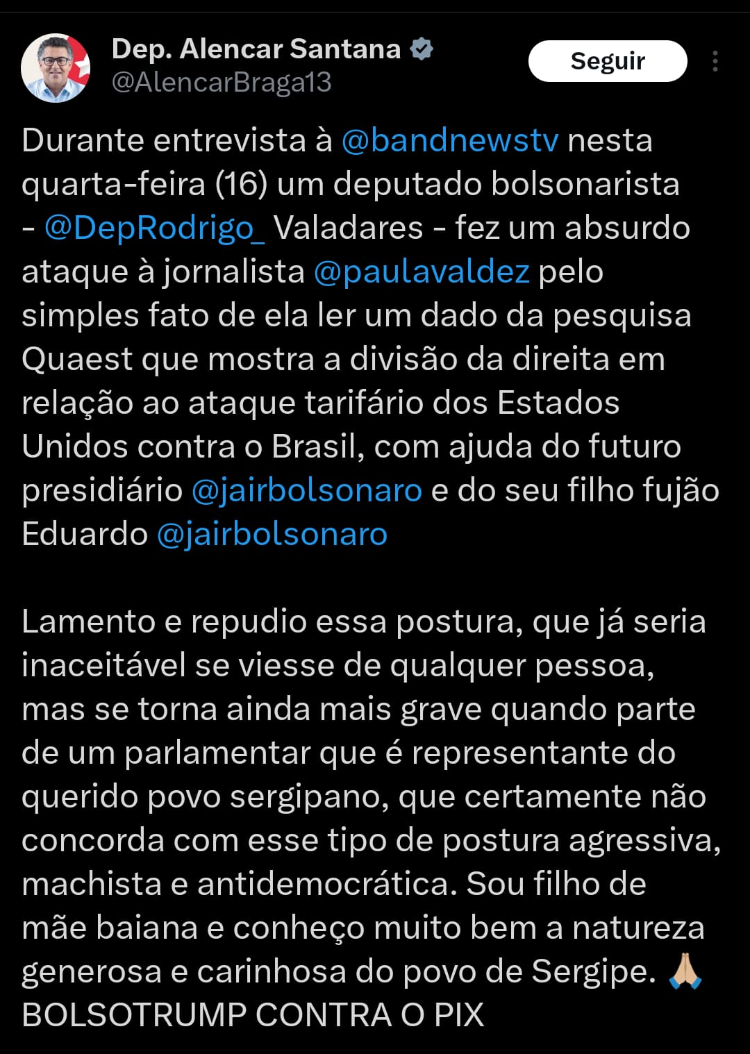 Alencar Santana também foi para as redes sociais, mas diferentemente de Valadares, postou vídeo em apoio à jornalista.