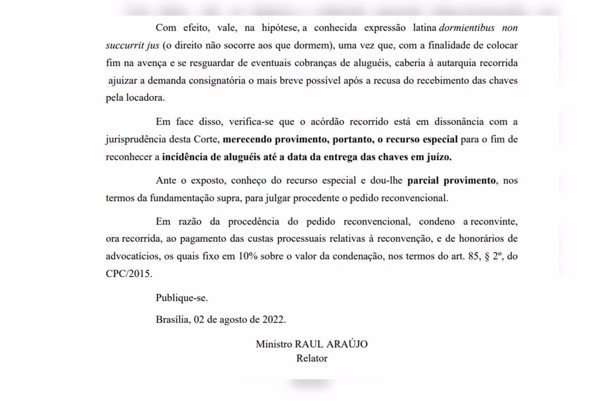 A Procuradoria-Geral do Distrito Federal (PGDF), representando o Detran-DF, apresentou agravo interno no STJ contra a decisão de Raul Araújo. No recurso, o órgão disse que a desocupação do imóvel foi comprovada, e “ficou patente a recalcitrância das locadoras em aceitar as chaves, não obstante as inúmeras tentativas e notificações”.