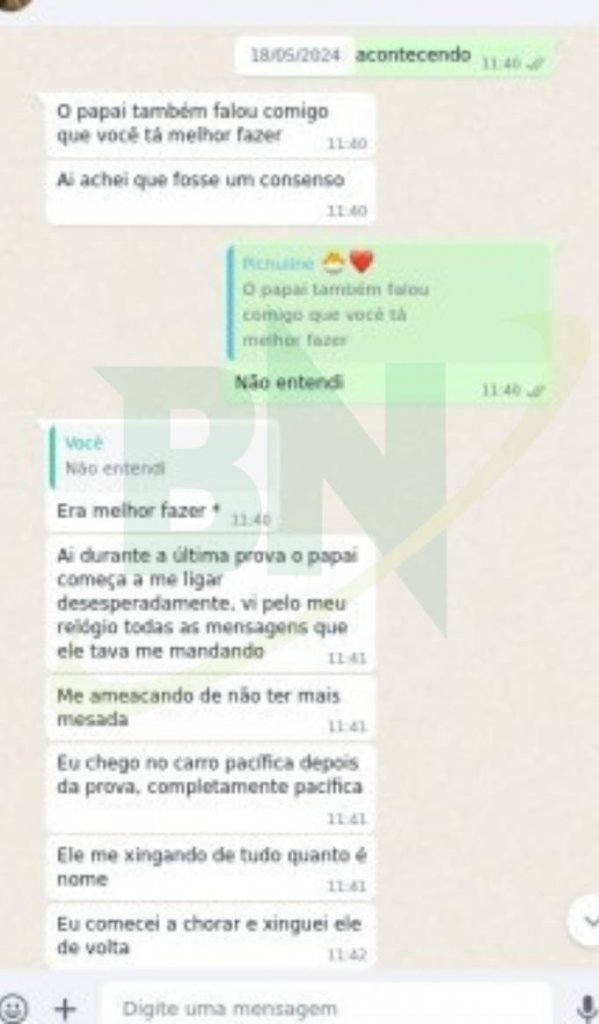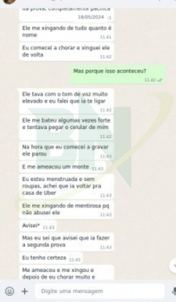 Ellen enviou mensagens à mãe relatando que Murilo a havia agredido física e verbalmente, ameaçado de morte e tentado tirar seu celular após um desentendimento. O “gatilho” para os fatos teria sido o fato de Ellen, que estava fazendo provas na escola, não ter atendido o telefone imediatamente. Ellen conseguiu filmar parte do ocorrido.