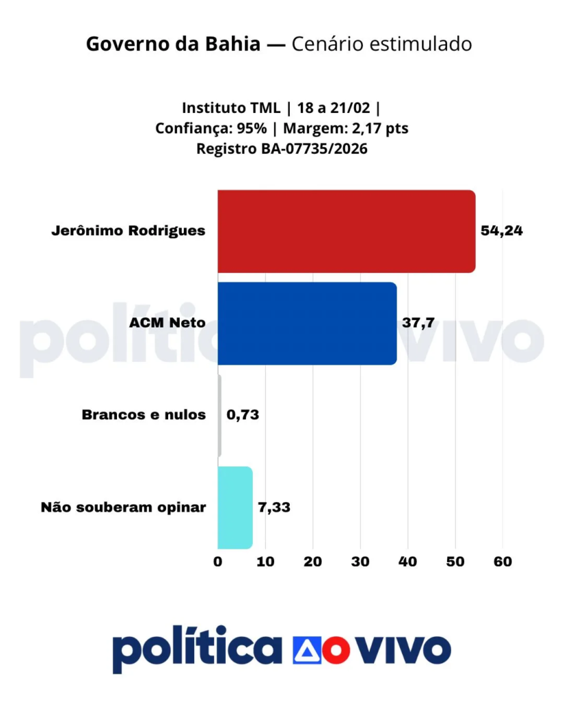 Em um segundo cenário estimulado, considerando apenas as candidaturas de Jerônimo e ACM Neto, o governador amplia a vantagem e aparece com 54,24%, enquanto o ex-prefeito de Salvador marca 37,70%. Brancos e nulos somam 0,73% e 7,33% não souberam ou não opinaram.