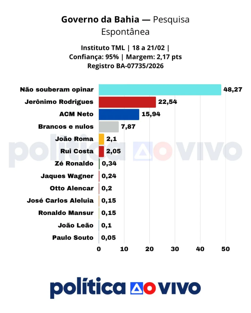 Na pesquisa espontânea, o governador Jerônimo aparece com 22,54%, seguido por ACM Neto, que tem 15,94%. Nesse cenário, João Roma tem 2,10%, enquanto Rui Costa 2,05%. Os dois últimos citados não são pré-candidatos ao Governo. Outros políticos também são citados.