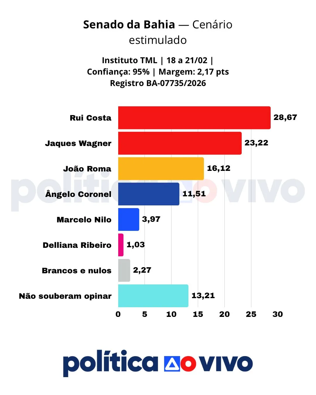 No cenário estimulado com os pré-candidatos colocados até agora, Rui Costa aparece na liderança com 28,67% das intenções de voto, seguido por Jaques Wagner, que tem 23,22%. Em terceiro lugar surge João Roma, com 16,12%, enquanto Ângelo Coronel, hoje sem partido após a já anunciada saída do PSD, marca 11,51% e aparece em quarto.