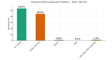 Pesquisa eleitoral revelou as intenções de voto dos eleitores de Ruy Barbosa (BA) para a eleição suplementar de prefeito que acontece neste domingo (6). Segundo a sondagem estimulada, Dr. George lidera com 53,4 % da preferência do eleitorado e venceria o pleito hoje.